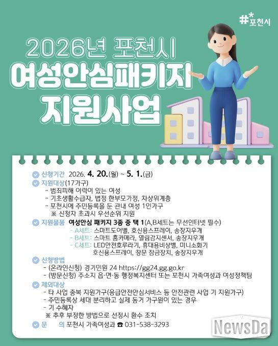 뉴스다 최광묵 기자 | 포천시는 여성 1인가구의 안전한 생활을 돕기 위해 ‘2026년 여성안심패키지 지원사업’을 추진하고, 4월 20일부터 5월 1일까지 대상자를 모집한다.