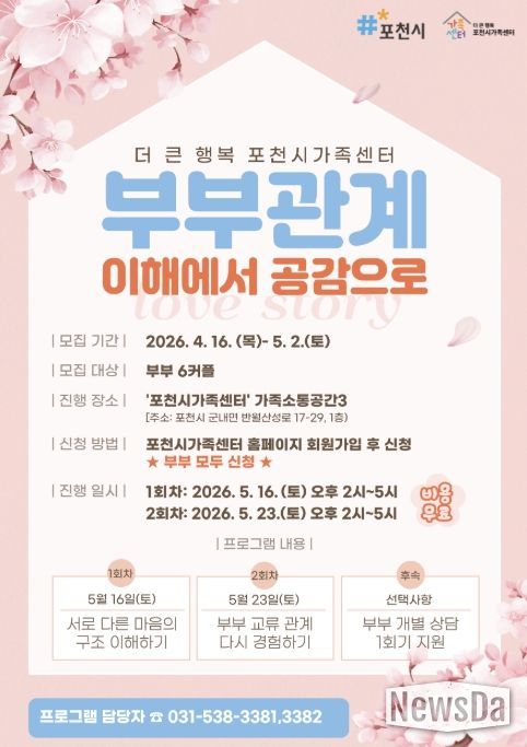 뉴스다 최광묵 기자 | 포천시 직영 더 큰 행복 포천시가족센터는 건강한 부부 관계 형성과 가족 기능 강화를 위해 부부 대상 프로그램 ‘부부 관계 이해에서 공감으로’ 참여자를 모집한다.