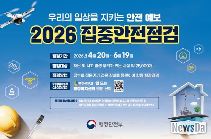 이와 함께 집중안전점검 기간 동안 시민이 직접 생활 주변 위험요인을 신고할 수 있도록 안전신문고 홍보를 강화하고, 주민이 점검을 신청하는 ‘주민점검신청제’를 활성화해 시민 참여 기반의 안전관리도 확대할 방침이다.