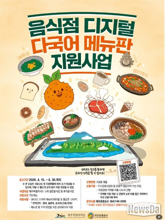 뉴스다 최광묵 기자 | 제주특별자치도와 제주관광공사(사장 고승철)는 15일부터 온라인 채널을 통해 ‘디지털 다국어 메뉴판 지원사업’에 참여할 도내 음식점을 모집하고 있다.