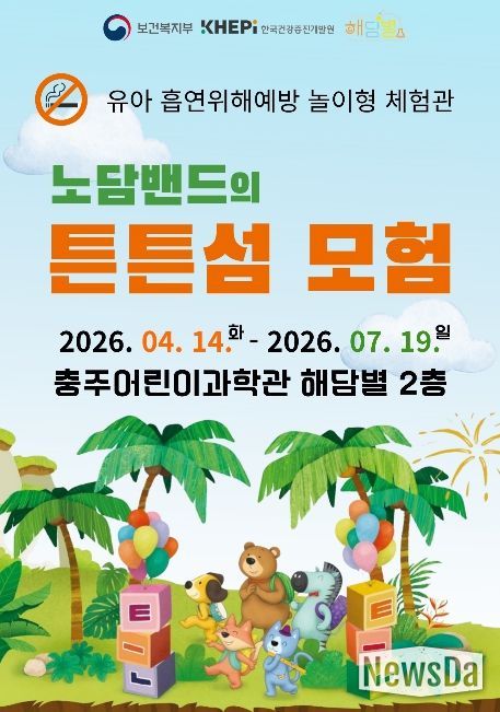 뉴스다 최광묵 기자 | 충주어린이과학관은 유아들이 흡연의 위해성을 인식하고 올바른 건강 습관을 형성할 수 있도록 돕는 놀이·체험형 특별전시 ‘노담밴드의 튼튼섬 모험’을 오는 7월 19일까지 운영한다고 밝혔다.