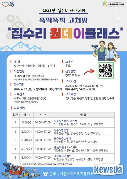 뉴스다 최광묵 기자 | 시흥시주거복지센터는 오는 5월부터 시민들의 자가 주거관리 역량 강화를 위해 2026년 집수리 아카데미 ‘뚝딱뚝딱 고쳐방’ 원데이 클래스를 진행하는 가운데 참가 교육생을 모집한다.