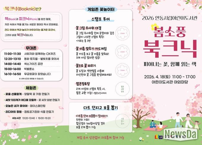 뉴스다 최광묵 기자 | 안동시립어린이도서관에서는 오는 4월 18일 11시부터 17시까지 시민이 도서관에서 마음껏 봄놀이를 할 수 있는'북크닉(book+picnic)'행사를 개최한다고 밝혔다.