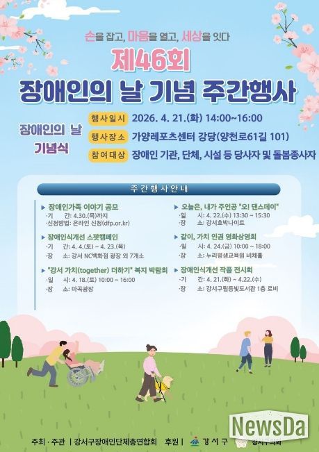 뉴스다 최광묵 기자 | 서울 강서구는 4월 20일 장애인의 날을 맞아, 오는 18일부터 일주일간 ‘제46회 장애인의 날 기념 주간행사’를 개최한다고 밝혔다.