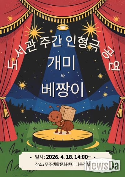 뉴스다 최광묵 기자 | 무주군이 도서관 주간(4.12.~18.)을 맞아 4월 18일 오후 2시부터 무주생활문화센터 다목적홀(지하 1층)에서 ‘배려와 존중’을 주제로 한 인형극 ‘개미와 베짱이’를 개최한다고 밝혔다.
