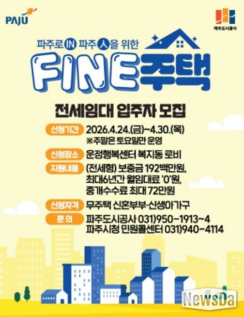 신청은 4월 24일부터 30일까지 운정행복센터 복지동(와석순환로 415)에서 방문 접수로 진행되며, 자세한 사항은 파주도시공사 및 파주시 누리집, 마이홈포털에서 확인할 수 있다.