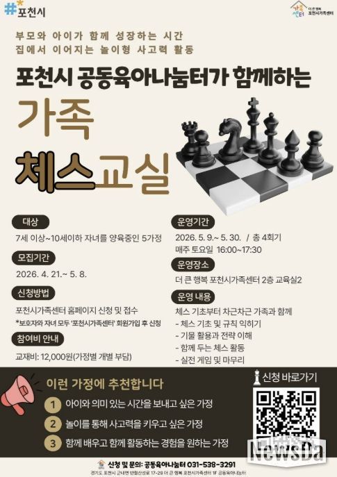 뉴스다 최광묵 기자 | 포천시 더 큰 행복 포천시가족센터는 공동육아나눔터 상시 프로그램의 일환으로 아동의 논리적 사고력 향상과 부모-자녀 간 긍정적 상호작용을 지원하기 위해 가족 참여형 체스 프로그램 '가족 체스 교실'을 운영한다고 밝혔다.