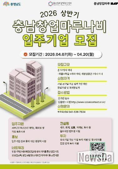 뉴스다 최광묵 기자 | (재)충남창조경제혁신센터는 이달 20일까지 2026년 충남창업마루나비 입주기업을 모집한다고 밝혔다.