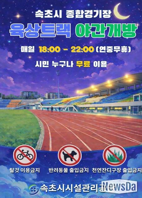 뉴스다 류대현 기자 | 속초시시설관리공단(이사장 이선규)은 오는 4월 20일부터 노학동 종합경기장 내 육상트랙을 시민들에게 야간 개방한다고 밝혔다.