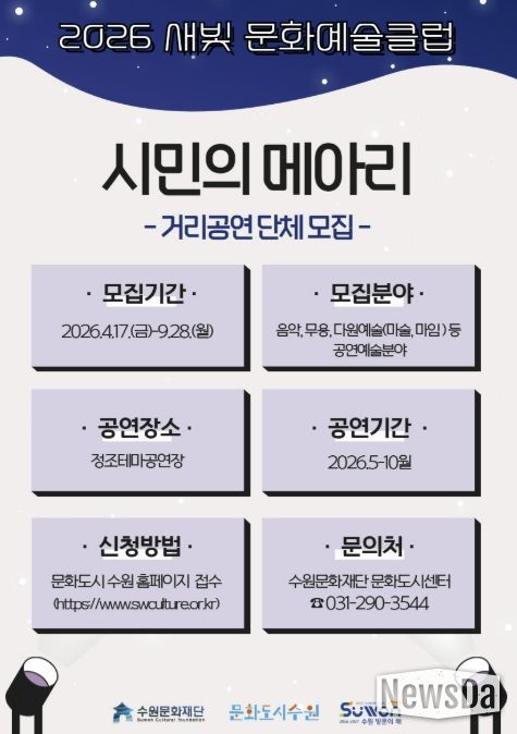 뉴스다 최광묵 기자 | 수원문화재단은 지역 공연예술의 활성화와 수원시민의 주체적 문화예술 참여를 위해 ‘새빛 문화예술클럽 '시민의 메아리'’ 사업에 참여할 생활예술단체를 모집한다.