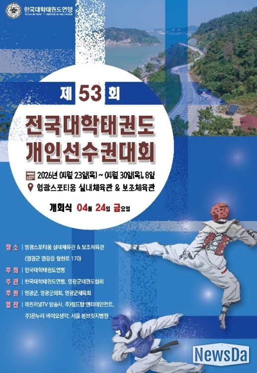 뉴스다 류대현 기자 | 영광군이 오는 23일부터 30일까지 8일간 제53회 전국대학태권도 개인선수권대회를 영광스포티움 국민체육센터 및 실내보조체육관에서 개최한다고 밝혔다.