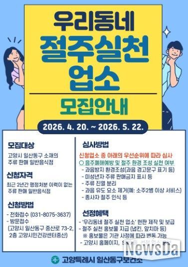 모집 기간은 오는 20일부터 5월 22일까지이며, 고양시 일산동구 소재 일반음식점 중 주류를 판매하는 업소를 대상으로 한다.