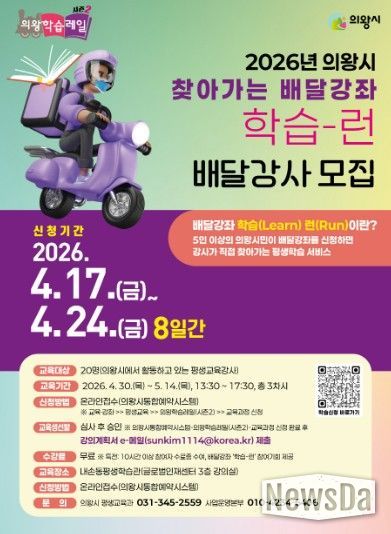 뉴스다 최광묵 기자 | 의왕시가 시민이 원하는 시간과 장소에 강사를 파견하는 맞춤형 평생학습 서비스인‘2026년 찾아가는 배달 강좌 학습-런(Run)’사업에 활동할 역량 있는 시민을 모집한다.