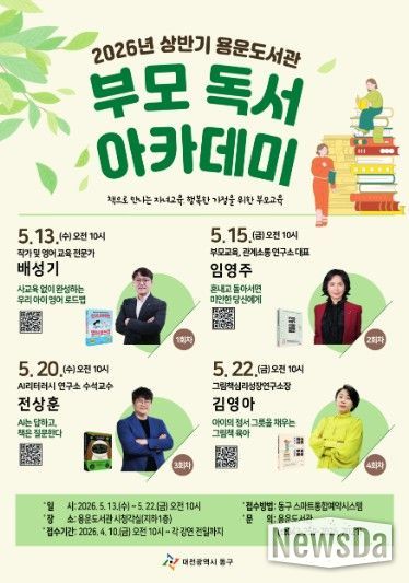 뉴스다 최광묵 기자 | 대전 동구는 자녀교육에 관심 있는 부모를 대상으로 전문가 초청 강연 프로그램인 2026년 상반기 ‘부모 독서 아카데미’를 운영한다고 17일 밝혔다.