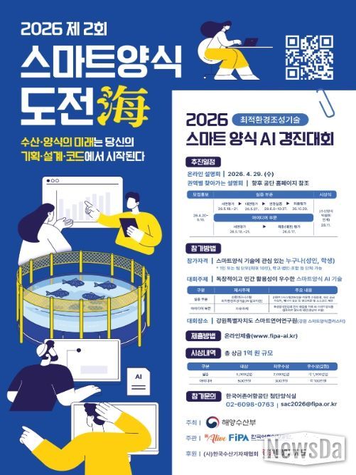 뉴스다 최광묵 기자 | 해양수산부와 한국어촌어항공단(이사장 홍종욱)은 4월 20일부터 5월 15일까지 ‘제2회 스마트양식 도전해(海) 경진대회’의 공모를 실시한다고 밝혔다.