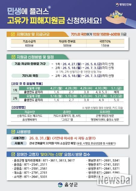 이번 지원금의 지급 대상은 올해 3월 30일 기준, 70%의 국민에게 소득 수준과 거주 지역에 따라 차등 지급한다. 특히 음성군은 비수도권으로 기초수급자 60만원, 차상위 및 한부모 50만원, 소득하위 70% 군민은 1인당 15만원을 지급받는다.