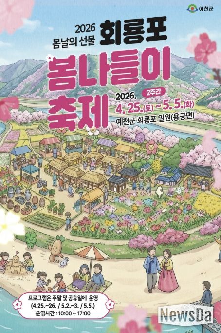 뉴스다 최광묵 기자 | 예천군은 오는 4월 25일부터 5월 5일까지 용궁면 회룡포 일원에서 '2026 회룡포 봄나들이 축제'를 개최한다.