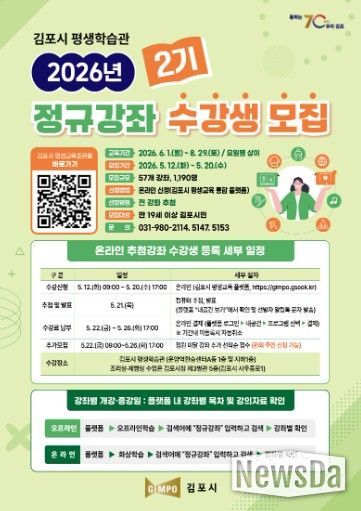 뉴스다 최광묵 기자 | 김포시가 시민의 평생학습 참여 기회를 확대하고 변화하는 사회 환경에 대응할 수 있는 역량 강화를 위해 ‘2026년 2기 평생교육 정규강좌’ 수강생을 모집한다고 밝혔다.