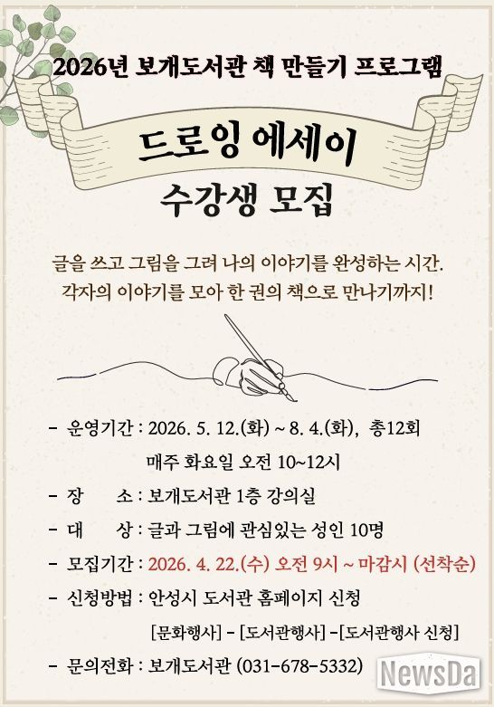 뉴스다 최광묵 기자 | 안성시 보개도서관(책문화센터)이 시민들의 창작 활동을 지원하고 일상 속 예술 경험을 확대하기 위해 오는 5월부터 ‘드로잉 에세이’와 ‘포토 에세이’ 책 만들기 프로그램을 새롭게 운영한다고 밝혔다.