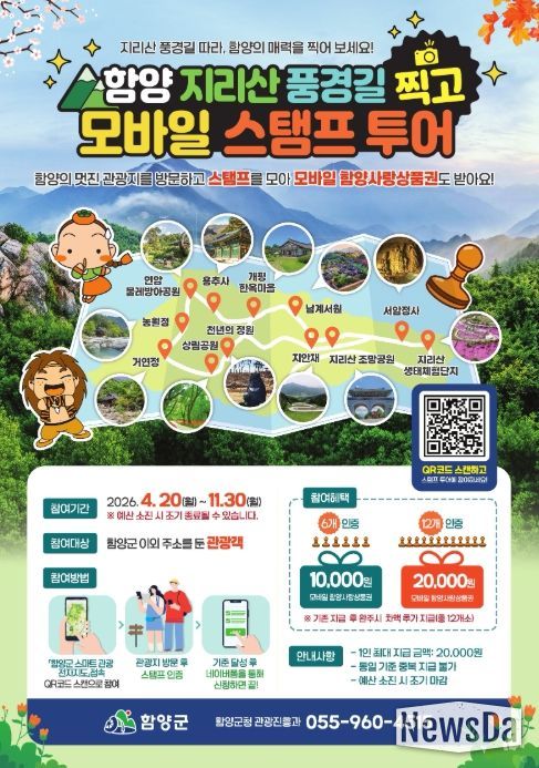 뉴스다 최광묵 기자 | 함양군은 함양의 대표 관광자원을 보다 쉽고 재미있게 즐길 수 있도록, 관광객 참여형 이벤트인 ‘함양 지리산 풍경길 찍고 모바일 스탬프 투어’를 운영한다고 밝혔다.