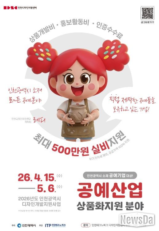 뉴스다 최광묵 기자 | 인천테크노파크(인천TP)는 인천 공예기업의 상품 경쟁력 강화를 위해 ‘2026년도 인천광역시 공예산업 상품화 지원사업’ 참여기업을 오는 5월 6일까지 모집한다.