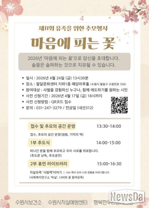 뉴스다 최광묵 기자 | 수원시자살예방센터가 24일 오후 1시 30분 팔달문화센터 예당마루홀에서 유족을 위한 추모행사 ‘제11회 마음에 피는 꽃’을 연다.
