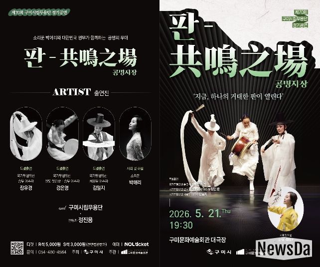 뉴스다 최광묵 기자 | 구미시는 5월 21일 오후 7시 30분, 구미시문화예술회관 대공연장에서 ‘제70회 구미시립무용단 정기공연 '판-共鳴之場공명지장'’을 개최한다.