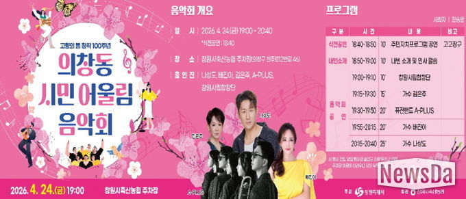 뉴스다 최광묵 기자 | 창원특례시는 오는 24일 19시 창원시축산농협 주차장(의창구 중동 402-2)에서 ‘의창동 시민 어울림 음악회’를 개최한다고 밝혔다.