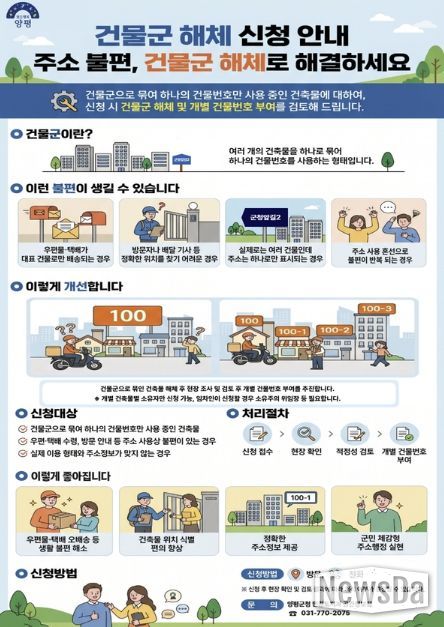 뉴스다 최광묵 기자 | 양평군은 건물군으로 묶여 하나의 건물번호만 사용하고 있는 건축물을 대상으로 건물군 해체 및 개별 건물번호 부여를 추진해 군민의 주소 사용 불편을 해소할 계획이라고 밝혔다. 이번 사업은 국민불편사항 개선 과제의 일환으로 추진되며, 실제 이용 형태와 맞지 않는 주소 체계를 정비해 보다 정확한 주소 사용 환경을 조성하기 위해 마련됐다.