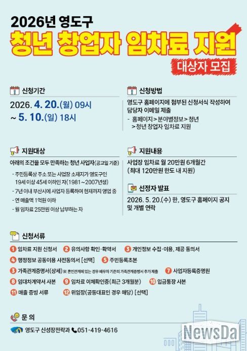 뉴스다 최광묵 기자 | 부산 영도구는 청년 창업가들의 경제적 부담을 덜어주고 지역 내 안정적인 사업 기반 마련을 돕기 위해 지난해에 이어 '2026년 청년 창업자 임차료 지원사업' 참여자를 모집한다고 밝혔다.