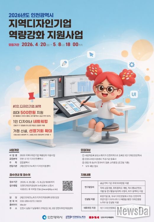 뉴스다 최광묵 기자 | 인천테크노파크(인천TP)는 오는 5월 8일까지 지역 디자인 산업의 경쟁력 강화를 위한 ‘2026 지역디자인기업 역량강화 지원사업’에 참여할 1인 디자인기업을 모집한다고 밝혔다.
