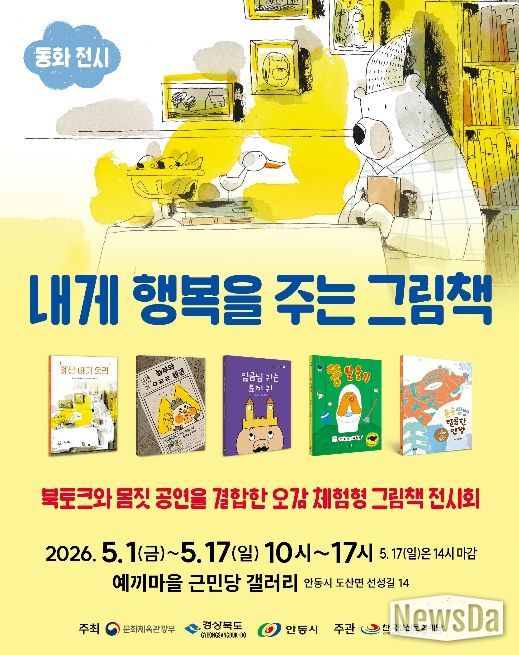 뉴스다 최광묵 기자 | 안동시와 (재)한국정신문화재단은 가정의 달 5월을 맞아 5월 1일부터 17일까지 안동 선성현문화단지 근민당 갤러리에서 ‘내게 행복을 주는 그림책’ 행사를 개최한다고 밝혔다.