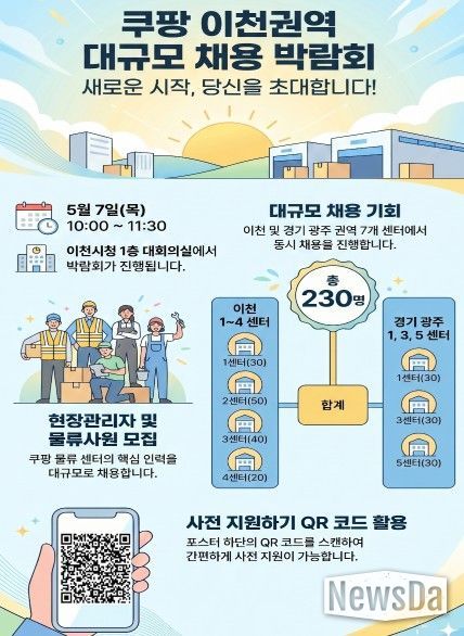 뉴스다 최광묵 기자 | 이천시는 오는 5월 7일 오전 10시부터 11시 30분까지 이천시청 1층 대회의실에서 ‘쿠팡 이천권역 대규모 채용 박람회’를 개최한다.