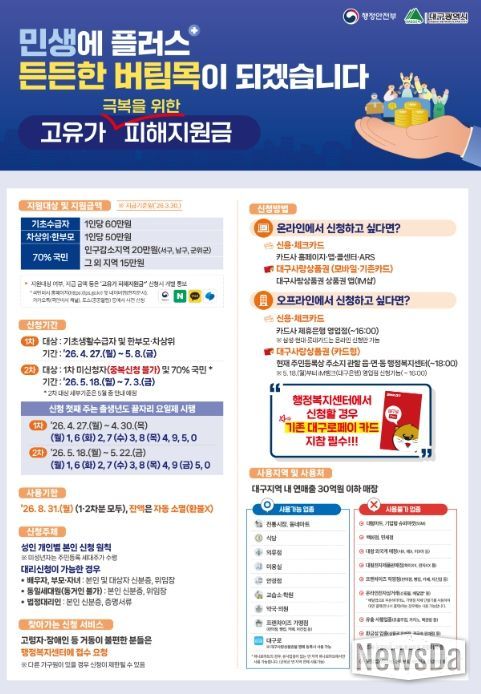 지원금은 유흥·사행업종을 제외한 대구광역시 내 연매출 30억원 이하 소상공인 매장에서 사용 가능하며, 사용기한은 8월 31일까지로 기한 내 미사용 금액은 자동 소멸된다.
