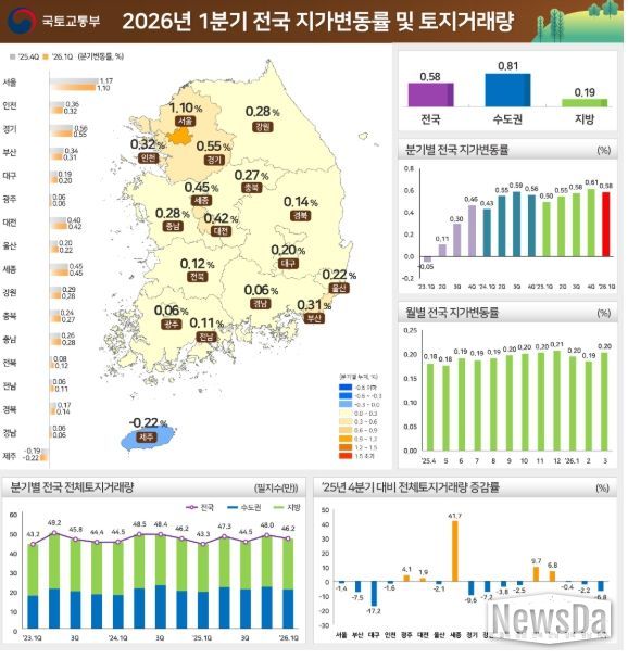 뉴스다 최광묵 기자 | 국토교통부와 한국부동산원(원장 이헌욱)은 '26년 1분기 지가변동률 및 토지거래량을 발표했다.