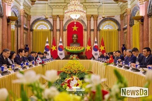 뉴스다 최광묵 기자 | 베트남을 국빈 방문 중인 이재명 대통령은 22일(현지시간) 오후 베트남 국가주석궁에서 또 럼 당서기장 겸 국가주석과 정상회담을 갖고, 양국 간 포괄적 전략 동반자 관계 발전 방안과 지역·국제 정세 등에 대해 심도 있게 논의했다고 이규연 청와대 홍보소통수석이 서면 브리핑했다.