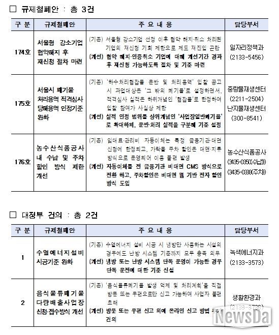 시는 자체적으로 개선 가능한 ▴서울형 강소기업 협약해지 후 재신청 절차 마련(174호) ▴서울시 폐기물 처리용역 적격심사 당해용역 인정기준 완화(175호) ▴농수산식품공사 내 수납 및 주차할인 방식 제한 개선(176호) 과제는 정비하고, ▴수열에너지 설비 시공기준 완화, ▴음식물류폐기물 다량배출사업장 신청․접수방식 개선 등 2건은 정부에 공식 건의했다.