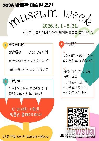 뉴스다 최광묵 기자 | 창녕군 공립박물관(창녕박물관, 박진전쟁기념관, 비봉리패총전시관)은 2026년 박물관·미술관 주간을 맞아 다채로운 프로그램을 운영한다고 밝혔다.