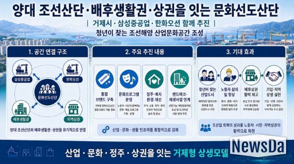 뉴스다 최광묵 기자 | 거제시가 삼성중공업, 한화오션과 체결한 지역상생발전 협약을 바탕으로 양대 조선산업단지와 인근 배후생활권, 지역상권을 함께 잇는 문화선도산단 조성사업 공모 준비에 본격 나선다.