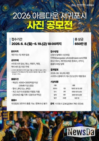 뉴스다 최광묵 기자 | 서귀포시는 지역의 다양한 매력을 발굴하고 이를 홍보 콘텐츠로 적극 활용하기 위해 ‘2026 아름다운 서귀포시 사진 공모전’을 개최한다.