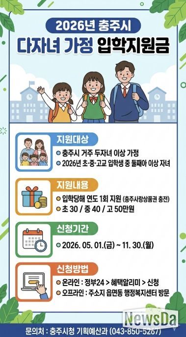 뉴스다 최광묵 기자 | 충주시는 다자녀 가정의 경제적 부담을 완화하고 안정적인 양육 환경을 조성하기 위해 2026학년도 초·중·고등학교에 입학하는 둘째 자녀 이상에게 입학지원금을 지원한다고 밝혔다.
