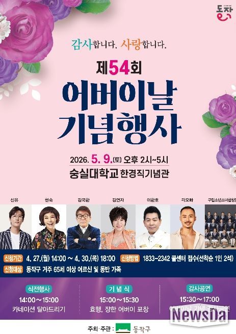 뉴스다 최광묵 기자 | 동작구가 오는 5월 9일 오후 2시 숭실대학교 한경직기념관에서 ‘제54회 어버이날 기념행사’를 개최한다고 밝혔다.