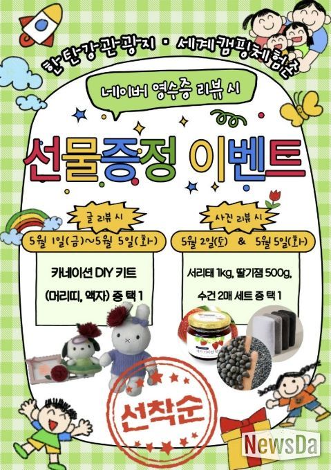 뉴스다 최광묵 기자 | 연천군시설관리공단은 가정의 달을 맞이해 오는 5월 1일부터 5월 5일 내 한탄강관광지 오토캠핑장 및 세계캠핑체험존을 방문하는 가족 단위 관광객을 위한 참여형 이벤트를 운영한다.