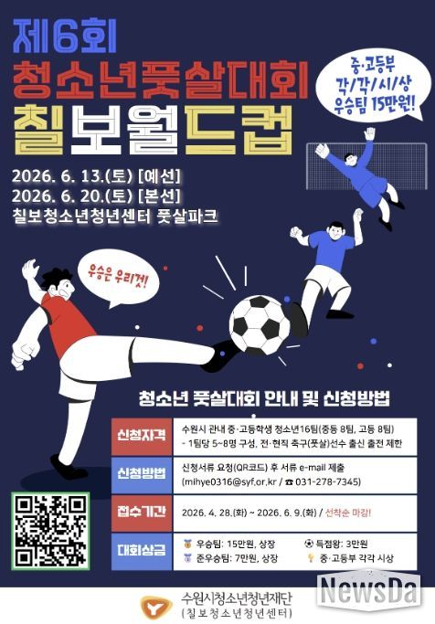 뉴스다 최광묵 기자 | 수원시청소년청년재단 칠보청소년청년센터는 오는 6월 13일(예선)과 20일(본선), 양일간 센터 내 풋살파크에서 녪. 청소년 풋살대회 [제6회 칠보월드컵]’을 개최한다고 밝혔다.