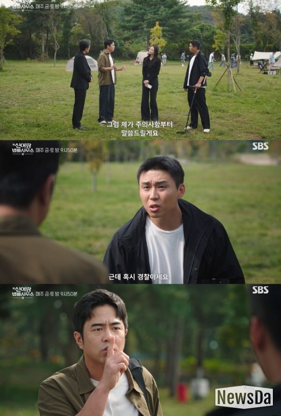 연쇄 아동 실종 사건을 수사하는데 단 4명만이 모인 비밀 수색 현장. 신이랑의 부재가 눈에 띄는 가운데, 비번까지 반납하고 달려온 김순경과 “주 안에서 불가능은 없다”며 전의를 불태우는 마태오, 그리고 평소보다 진지해진 윤봉수의 리드가 눈길을 끈다. 윤봉수는 “사체가 매장된 곳은 유기물 때문에 식물 성장이 다르다”며 다년의 단역생활로 쌓은 전문적 지식을 뽐내는가 하면, 금속 탐지기 앱을 활용해 단추나 지퍼 하나도 놓치지 말 것을 당부한다.