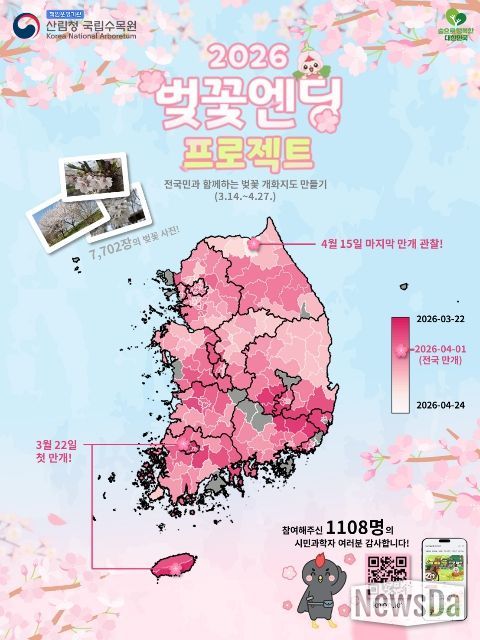 뉴스다 최광묵 기자 | 산림청 국립수목원(원장 임영석)은 2026년 봄, 시민과학 참여 프로그램 '벚꽃엔딩 프로젝트'를 통해 국민과 함께 전국 벚나무 개화 현황을 기록하고, 이를 지도 형태로 시각화한 ‘전국 벚꽃 개화지도’를 공개했다고 밝혔다.