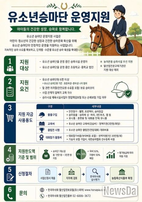 뉴스다 류대현 기자 | 농림축산식품부와 한국마사회는 승마를 통해 지역 사회 유소년들이 새로운 꿈과 기회를 발견할 수 있도록 전국 57개 유소년 승마단의 운영을 지원한다