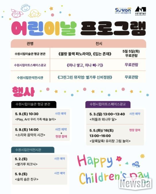 뉴스다 최광묵 기자 | 경기도 수원시립미술관은 2026년 어린이날을 맞아 수원시립미술관 행궁 본관, 수원시립아트스페이스광교, 수원시립만석전시관에서 즐거운 하루를 보낼 수 있는 전시와 다양한 프로그램을 운영한다.