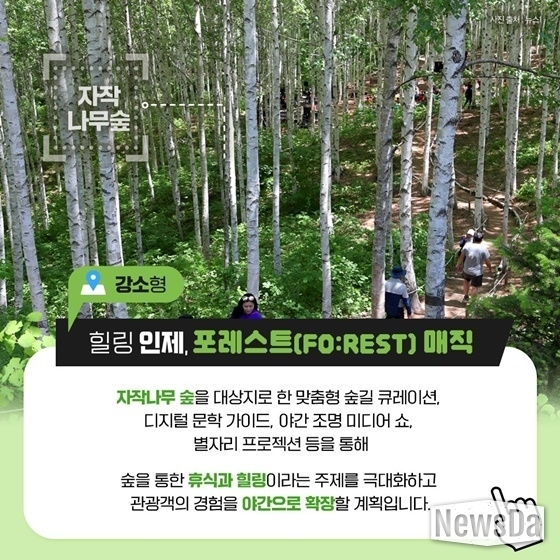 자작나무 숲을 대상지로 한 맞춤형 숲길 큐레이션, 디지털 문학 가이드, 야간 조명 미디어 쇼, 별자리 프로젝션 등을 통해 숲을 통한 휴식과 힐링이라는 주제를 극대화하고 관광객의 경험을 야간으로 확장할 계획입니다.