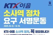 뉴스다 최광묵 기자 | 부천시는 서해선 KTX-이음 열차의 소사역 정차를 추진하기 위해 10만 서명운동을 시작했다. 이번 서명운동은 12월 19일까지 진행되며, 관내 시민과 인천·서울 서남권 주민의 광역철도 접근성을 높이고, 지역 산업과 관광 활성화를 통한 경제적 효과를 목표로 추진된다. 온라인 서명운동은 큐알(QR)코드와 부천시 홈페이지를 통해 참여할 수 있다. 오프라인 서명운동은 시청과 원미구·소사구·오정구청, 각 동 행정복지센터 민원실을 비롯해 소사역, 부천시청역 등 주요 전철역과 아파트 단지 등 시민 접근이 쉬운 장소에서 진행된다. 이와 함께 시는 이번 서명운동에 시민과 지역 단체, 학교 등 다양한 주체가 참여할 수 있도록 적극적인 홍보활동도 병행할 계획이다. 특히‘서해선 KTX-이음 소사역 정차’의 필요성과 지역 발전 효과를 널리 알리기 위해 소셜네트워크서비스(SNS), 지역 축제 현장 캠페인 등을 통해 적극적으로 홍보할 예정이다. 조용익 부천시장은 “KTX-이음 소사역 정차는 단순한 교통 개선을 넘어, 서해선 시대에 부천이 수도권 서남부의 중심으로 도약할 수 있는 계기”라며 “시민의